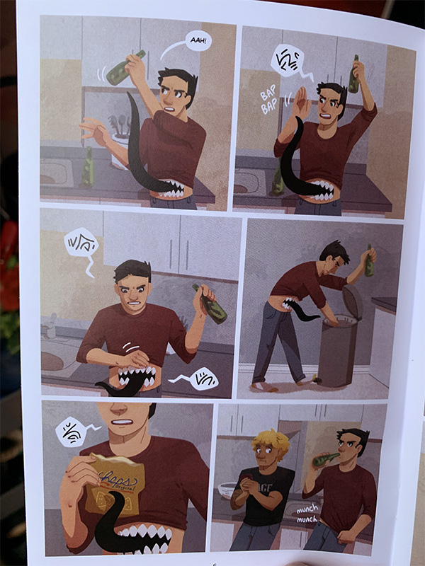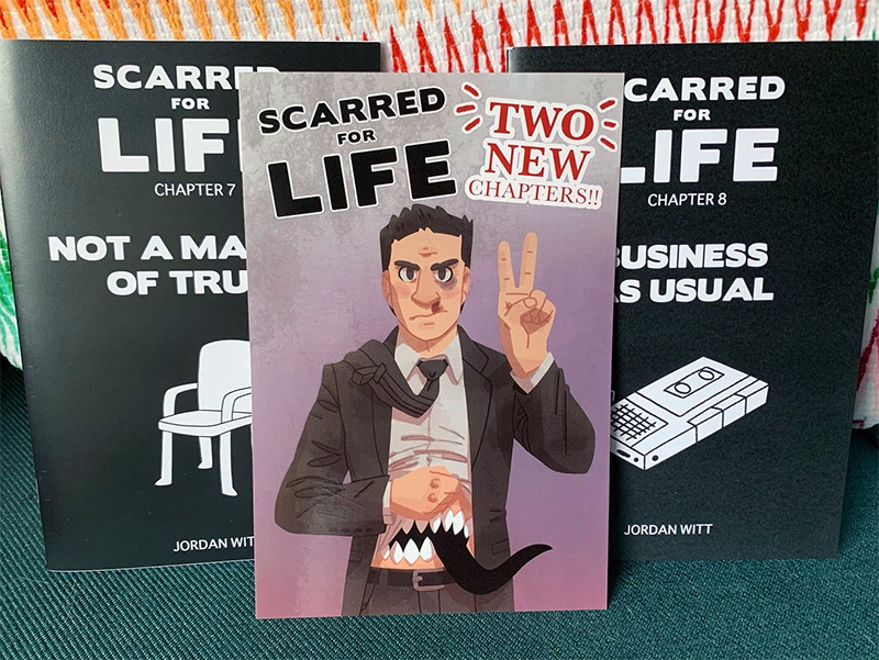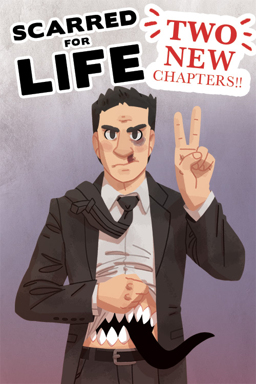 Chapters 7 and 8 of my comic Scarred for Life, about two FBI agents and their intern. One of the agents has a giant monster mouth on his stomach but doesn't seem to bothered by it.